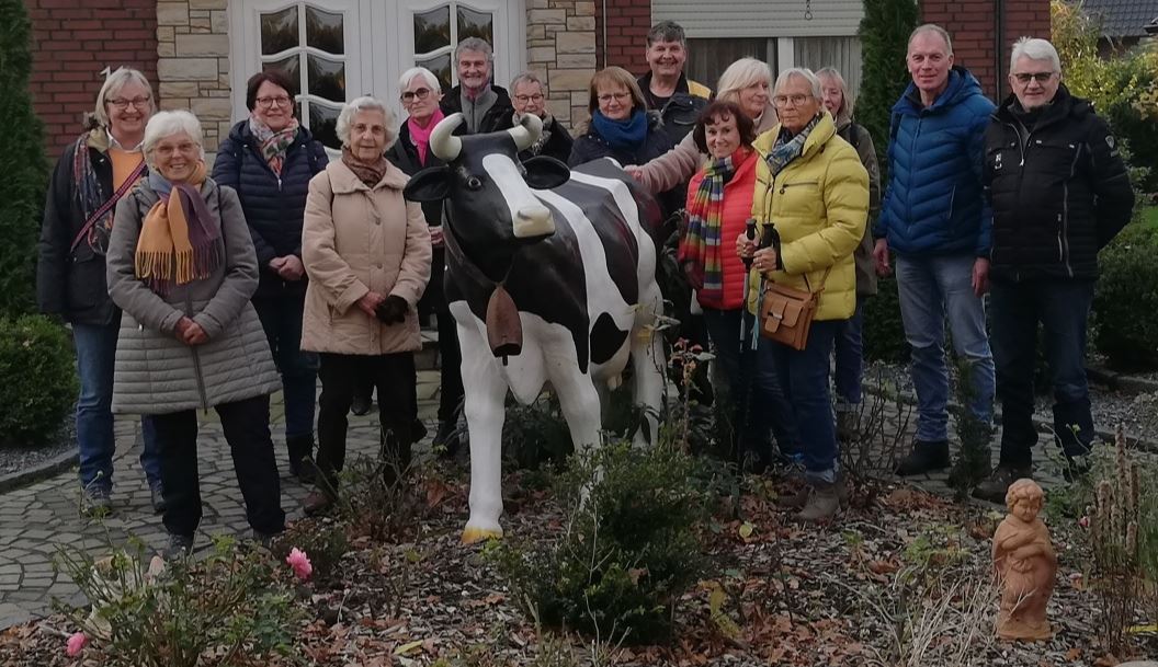 26 Wanderer trafen sich am Ehrenmal in der Bauernschaft Elvert, um von dort aus eine 5 km lange Wanderung zu starten. Über schöne Waldwege und an der Alten Fahrt entlang, kehrte die Gruppe zum Kaffeetrinken auf einem Bauernhof ein. Hier bekamen die Teilnehmer auch interessante Informationen zur Milchviehhaltung.